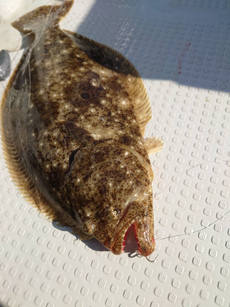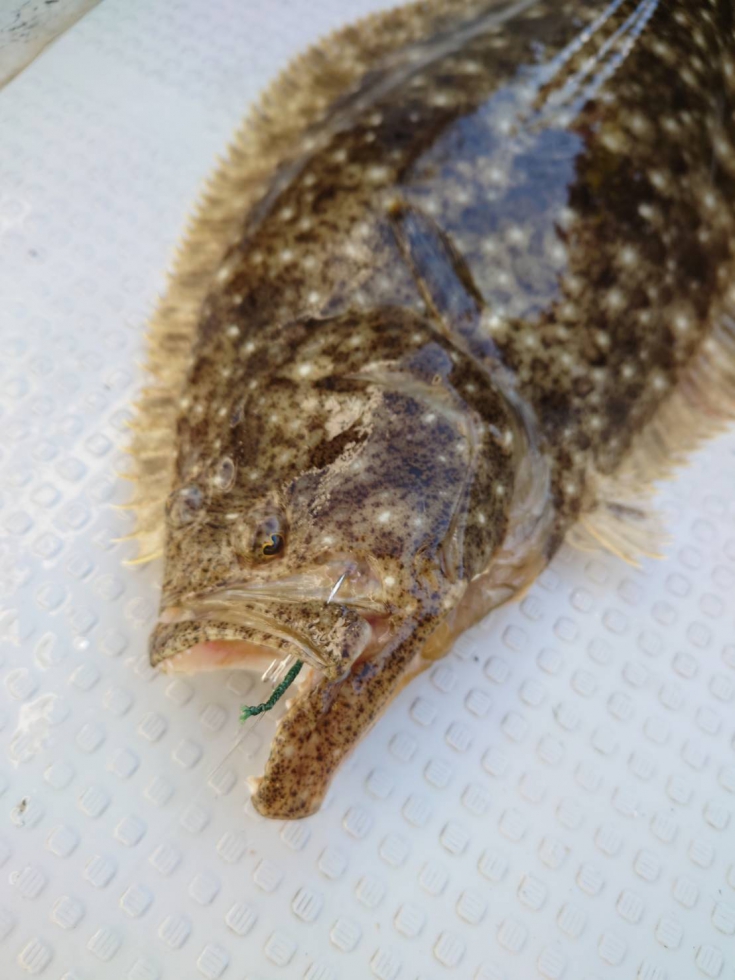 上がってきたのは、40cm弱の小ぶりではありましたが、本命ヒラメ。ようやく出会えた1枚!リベンジ達成です。