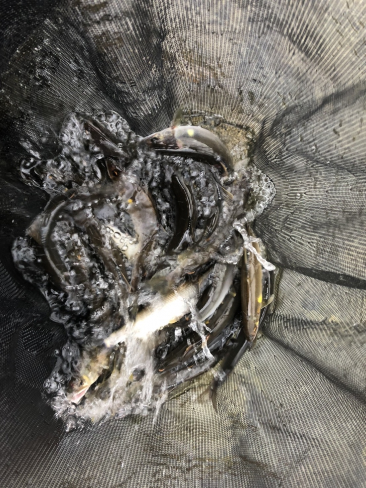この時期は梅雨どきとあって、まだまだ皮も柔らかく、出来上がりの早い湖産は重量も増すので身切れが多発します。