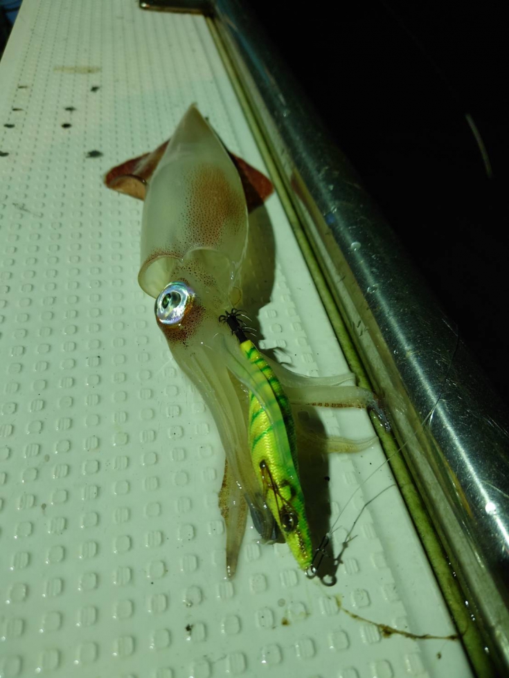 後々、気づいたのですが、イカの群れは少ないものの活性が高いパターンで、派手目のオレンジやチャートのエギで、活性の高い個体を少ない群れから効率よく抜いていくのが正解パターン。