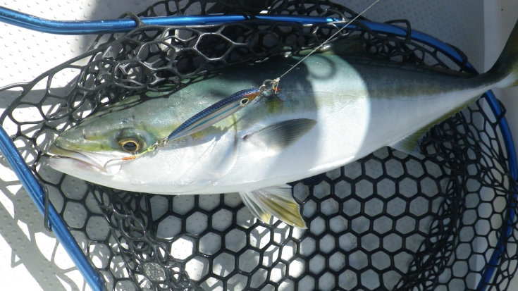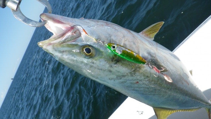 投次郎に上下ジガーライト早掛の2番のフックで誘っての釣り方と、トリプルフックにマクスドスピンを付けてのただ巻き、ストップ&ゴーでのくわせのタイミングを与える釣り方をしました。