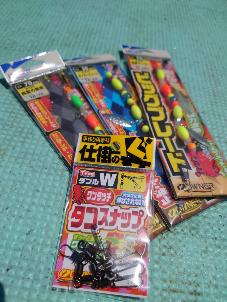 この日は、潮も小さく船タコ集寄ビッグブレードとワンタッチタコスナップダブルで、エギ2個付けでスタート。カラーは定番のチャート&グリーンでファーストヒットを狙います。