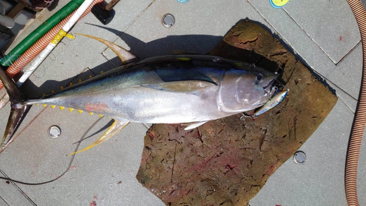 その後次第にナブラが強くなり、ナブラの中に撃ち込めるようになり誰かヒットしそうな雰囲気の中、今回念願のキャスティングキハダ初挑戦の影浦さんにヒット!