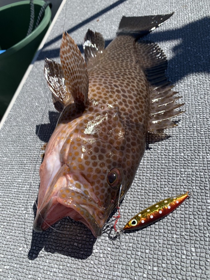 まずは投技ジグをタダ巻きしてスイミングで良型のオオモンハタをゲット!