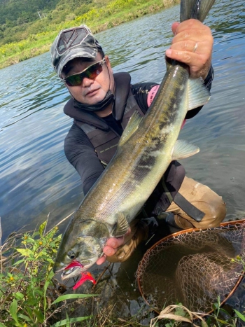 するとまたジャンプしたと思ったら、ドラグ音とともに妻のルアーにヒットしていました。ドタバタしながら多くのギャラリーが見守る中、ネットイン。