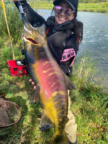 80cm 4.5kgの鼻曲り、婚姻色のでた雄鮭をキャッチしました。