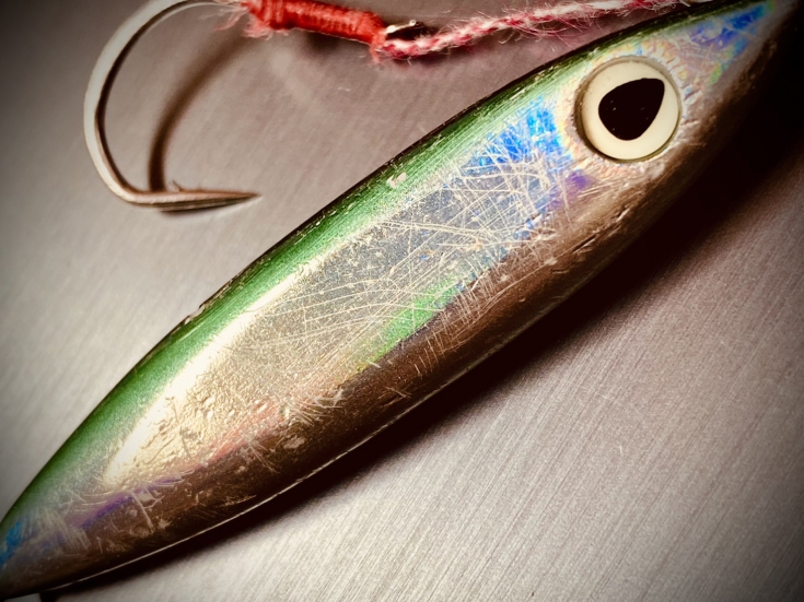 とりあえず魚がいることは判ったので、2本目をゲットした時点でバイブレーションプラグを仕舞い、テイルフック「STX-45ZN」にブレード「マスクドスピン」をセットした30gのメタルジグ「投次郎」に切り替えた。