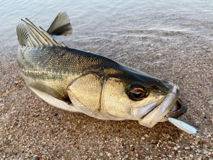 バイト~フッキングしてから横方向にロッドを寝かせ、シーバスがエラ洗いしないよう水中を泳がせるイメージで、ロッドを十分にベントさせながらリールで巻いて寄せてくる。この方法が功を奏していたのではないかと思う。