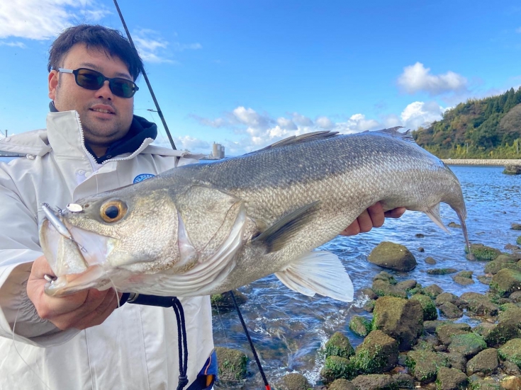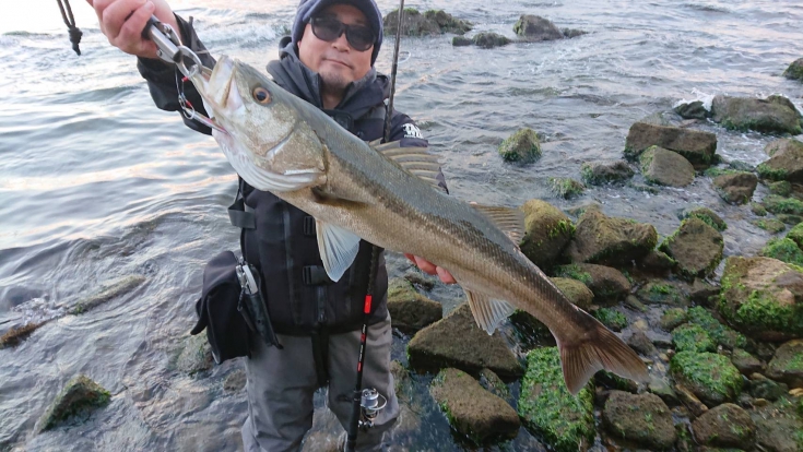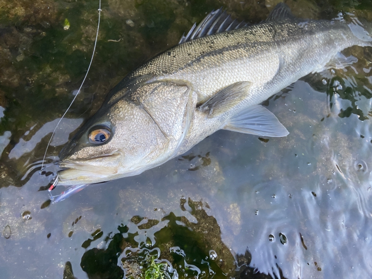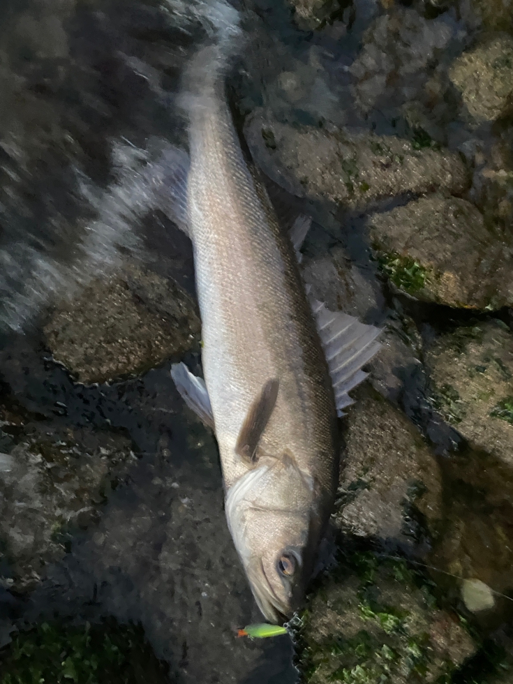 集中して巻いていると2度ほど小さいシーバスらしきアタリがあり、60cmほどの綺麗な個体を釣ることができ一安心。