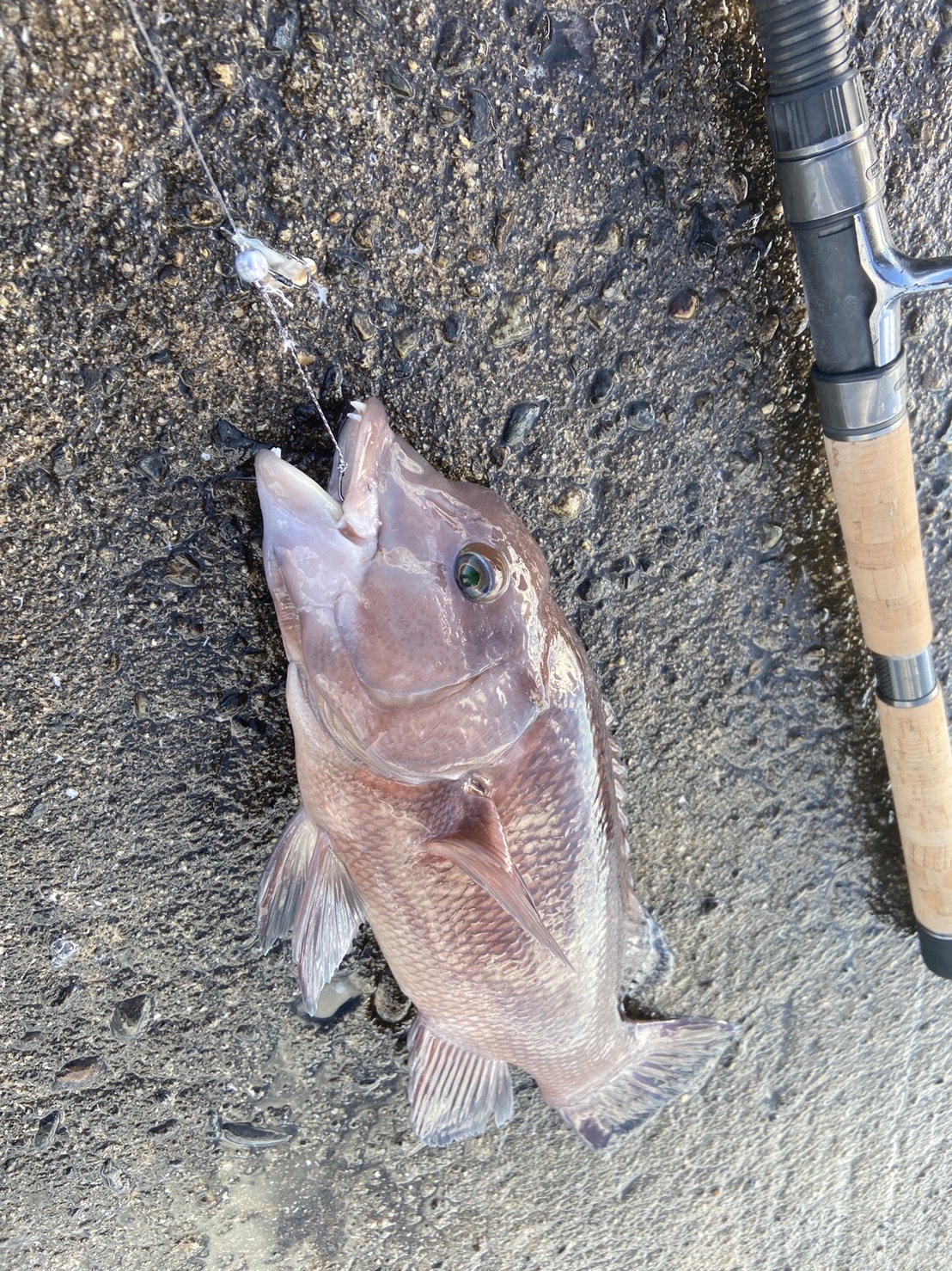 いつもは竿が完全に入るまで待つのがスタイルですが、今回は牡蠣のむき身ですし、さらに虫パフックを付けているので早合わせしてみると、フッキングに成功。