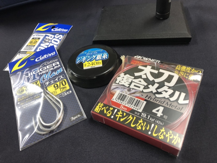 ①太刀複合メタル4号とジギング組糸180ld、ジガーミディアムチェイス9/0、ソリッドリング6番を用意します。
