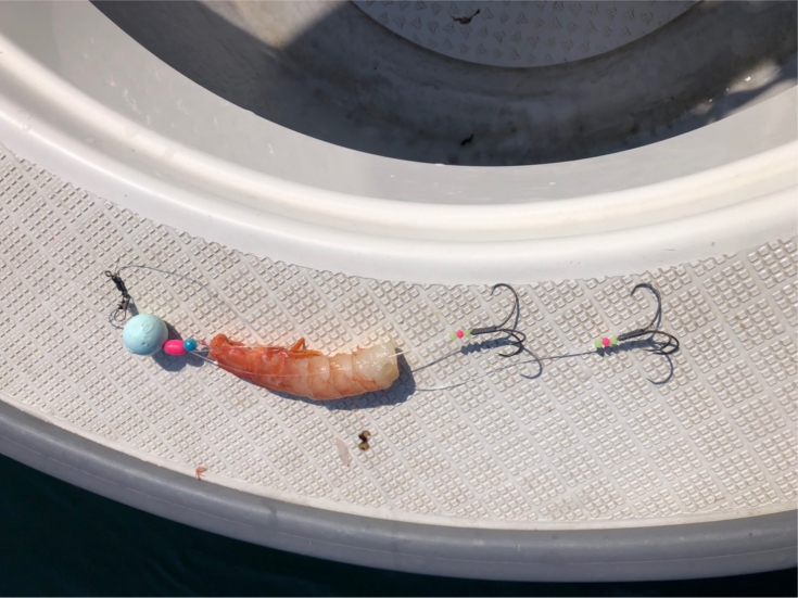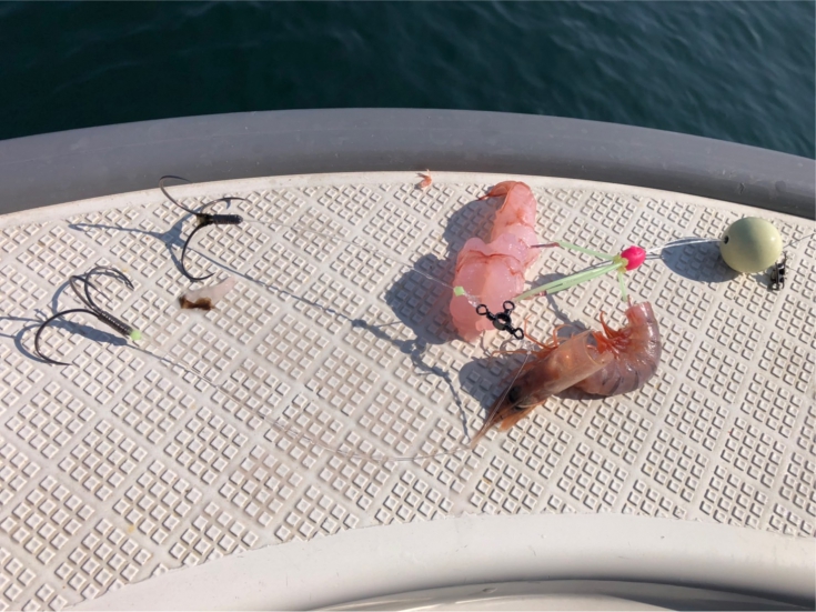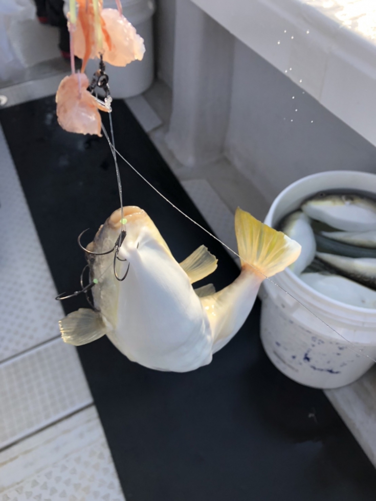 この時期は流しカットウだと船の流速にフグの動きが追いつかない事が多いので、アンカーの係り釣りカットウで狙います。