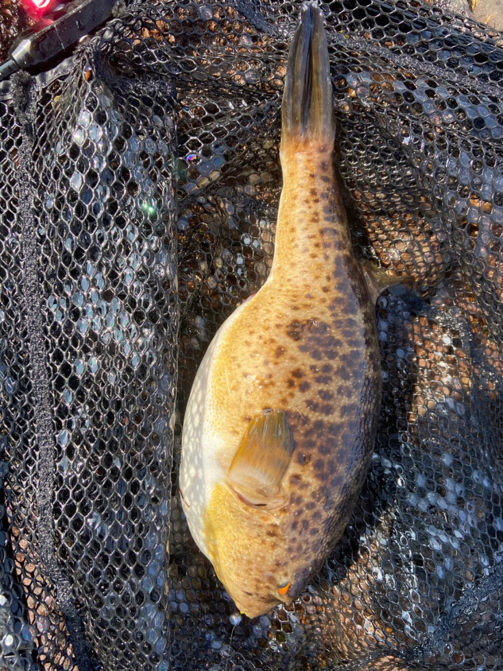 そして次にヒットしたのはフグでしたが…大きすぎて抜けないのでタモを使って取り込みました(笑)