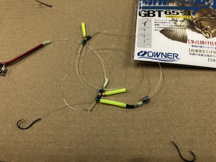 当日の使用仕掛けは剣剛カレイ仕掛GT65-3。65cmの3本仕掛けにハリは3本とも【剣撃カレイ】に交換。