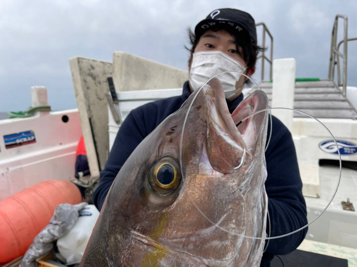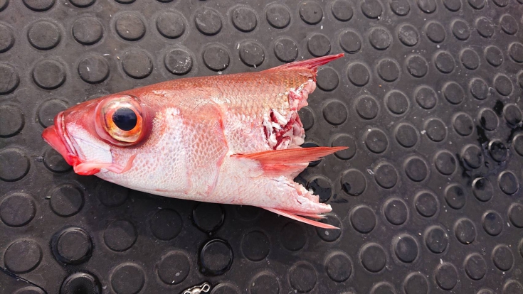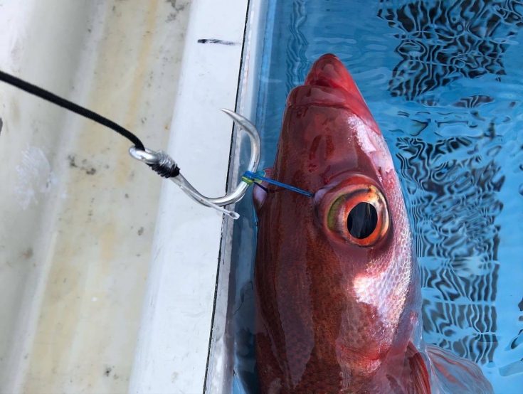 サメ肌で泳いだ際にハリスが擦れ途中でブレイクし、なかなか船縁まではあがりませんが、ハリの掛かりなどたくさんサンプルをとることができました。