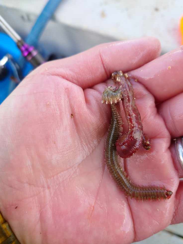 マムシは1/2〜1/4にカット、青イソメは一匹〜1/2にカットして使用します。