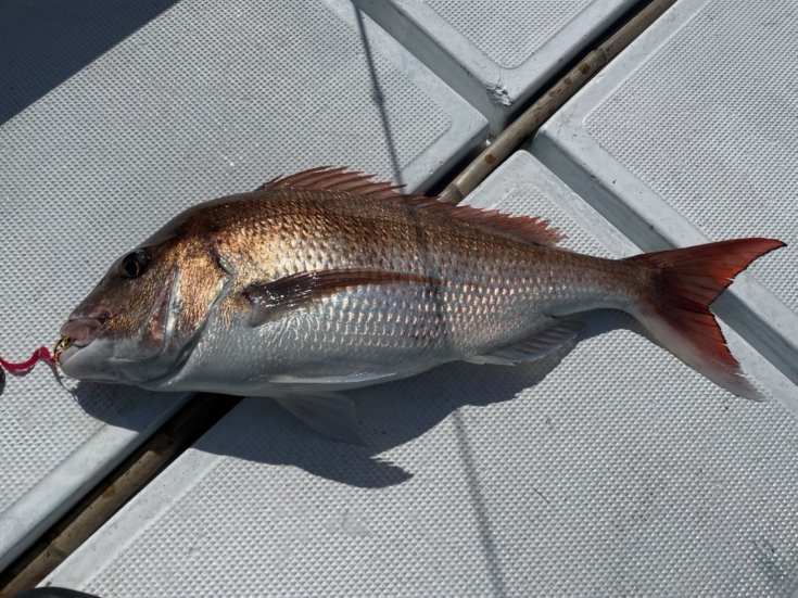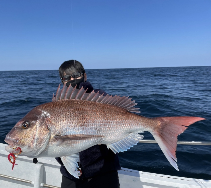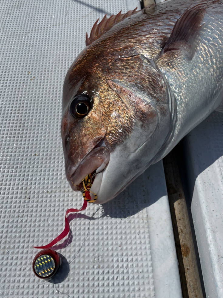 90m~130mほどのめぼしい所を探索していると、70㎝ほどの良型真鯛をキャッチ♪