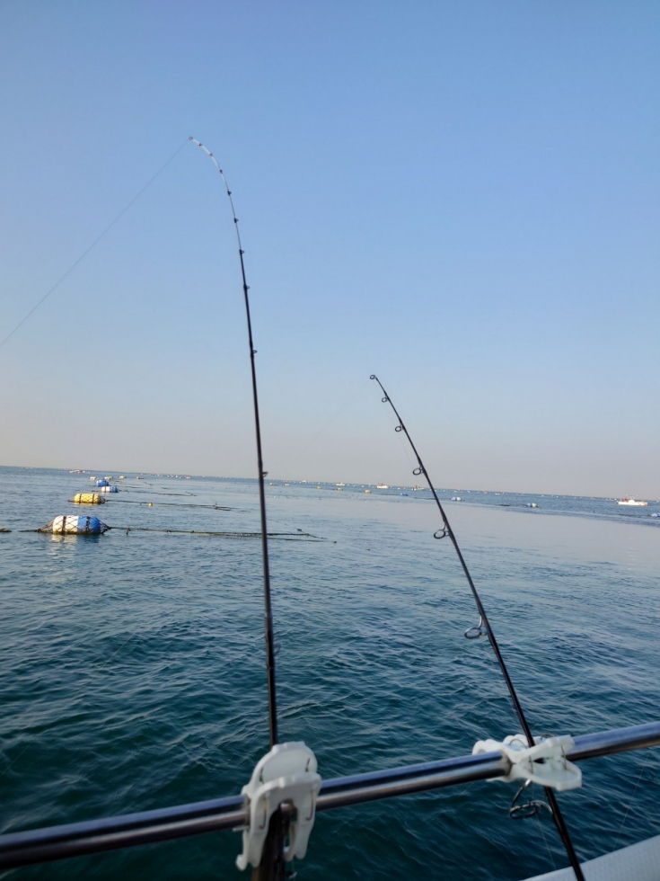 置き竿と小突きの2本出しで、置き竿は釣座にもよりますが、オモリは100号〜80号を使用するので遠投出来るスピニングのジギングロッドに落ち着きました。