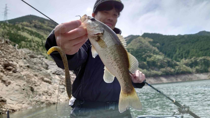 ヒットルアーはロングカーリーのフリーリグ。やはり池原ダムのバスはロングワームがお好きなご様子。