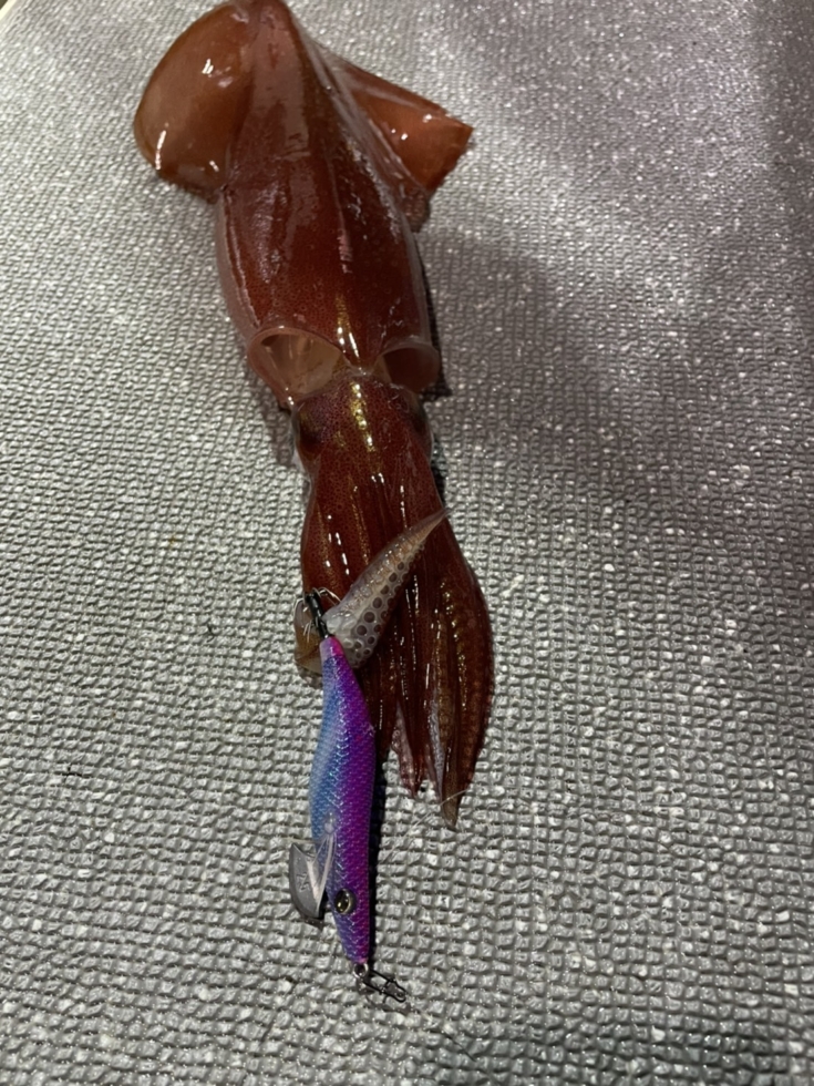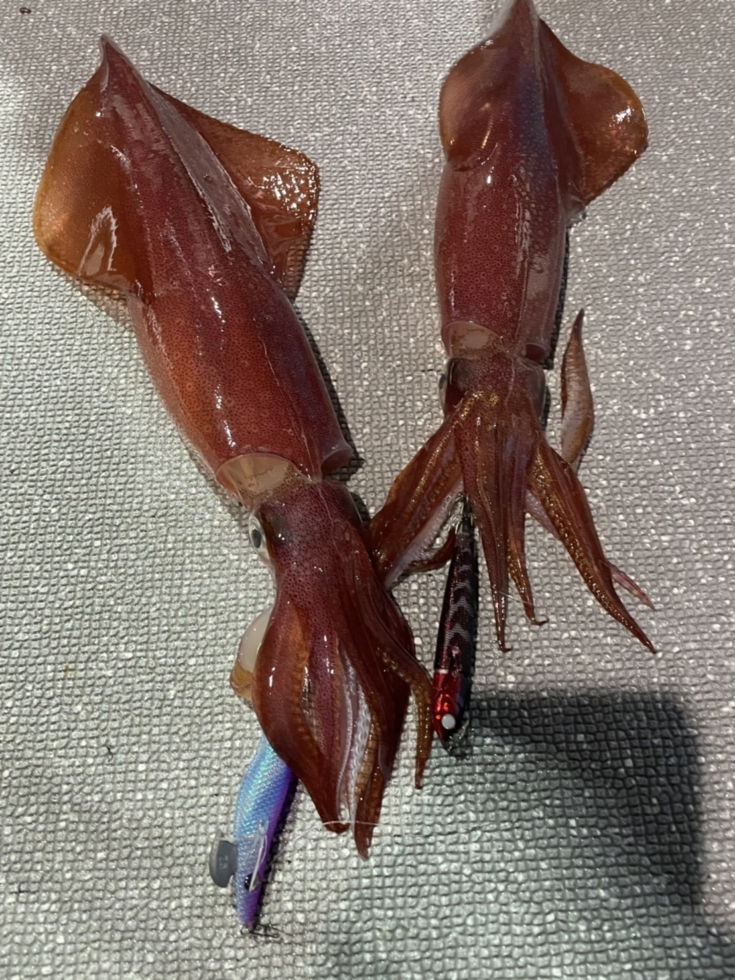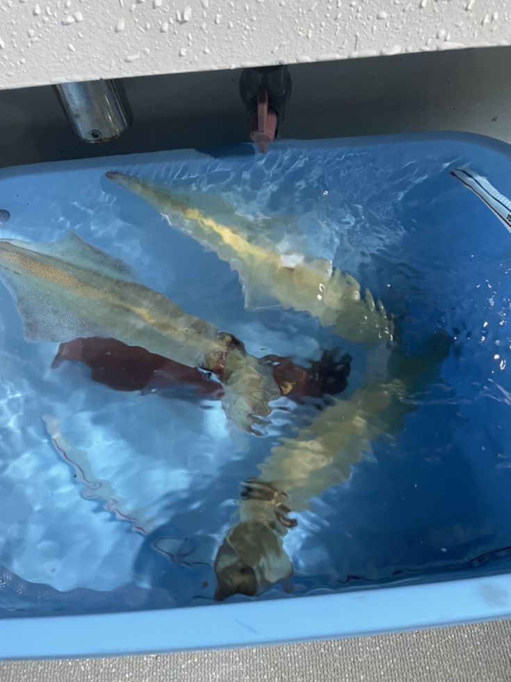 船長の指示通り、2.5m仕掛けを浮かせて、構えますが、なかなか反応は得られず、たまにイカがロックオンされて、暴れるものの、バイトには至らず。