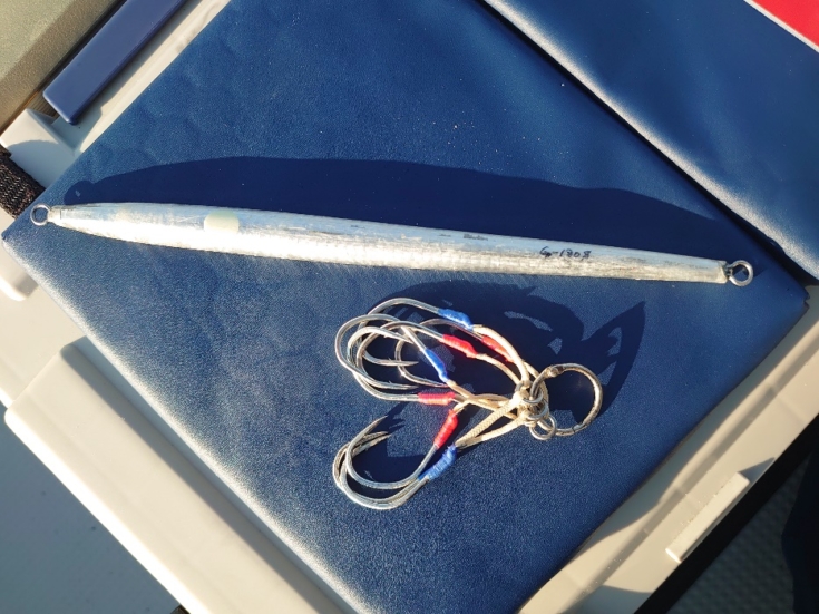 水深は60mほどでガタージグ180gに渋谷製ブルーチェイサー9/0でシャクります。