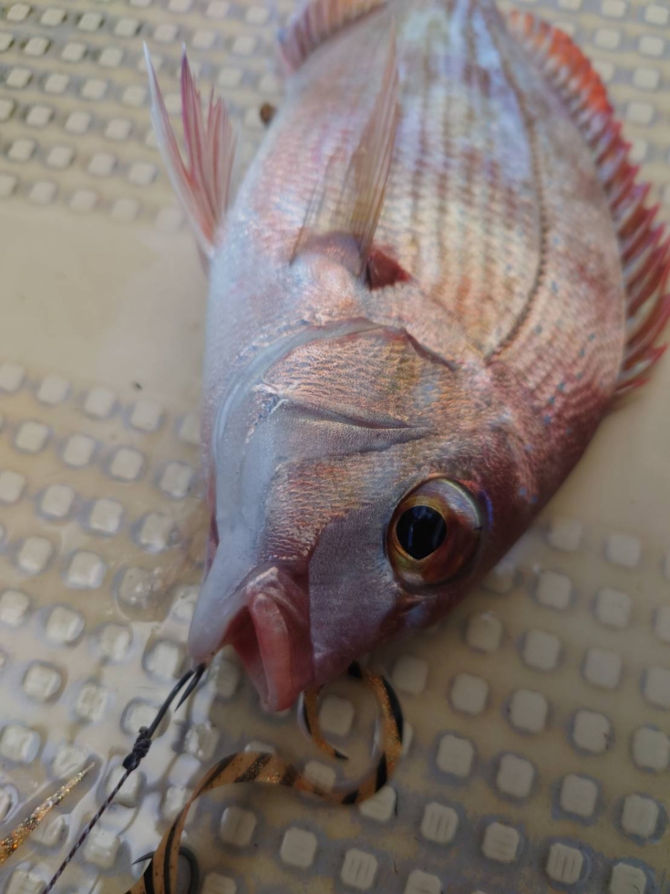 ジガーライトマダイ早掛が唇の薄皮を辛うじて捉えてあがって来た1枚。