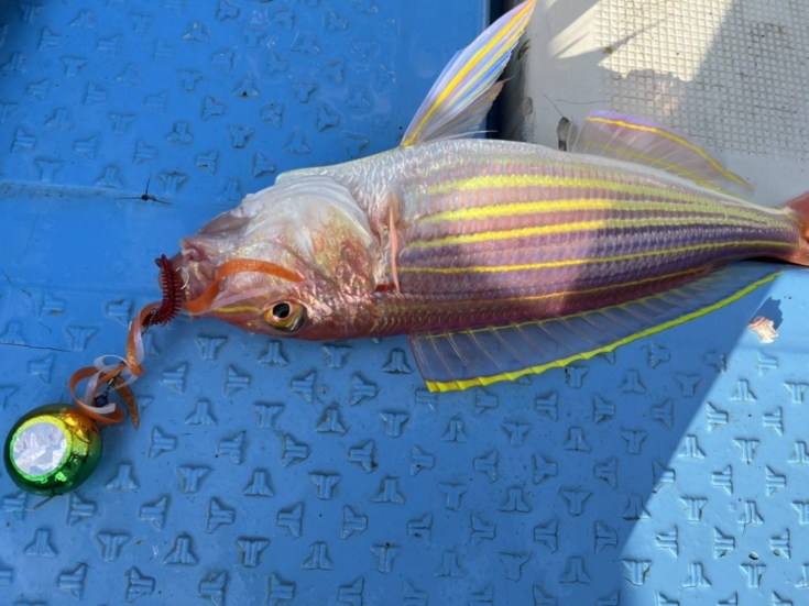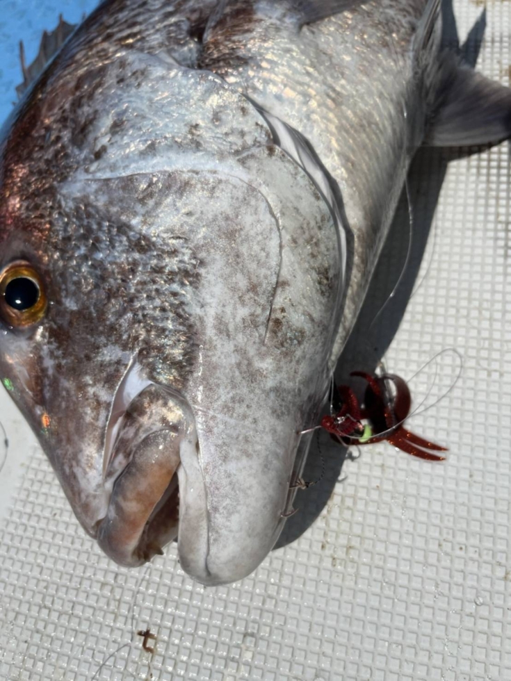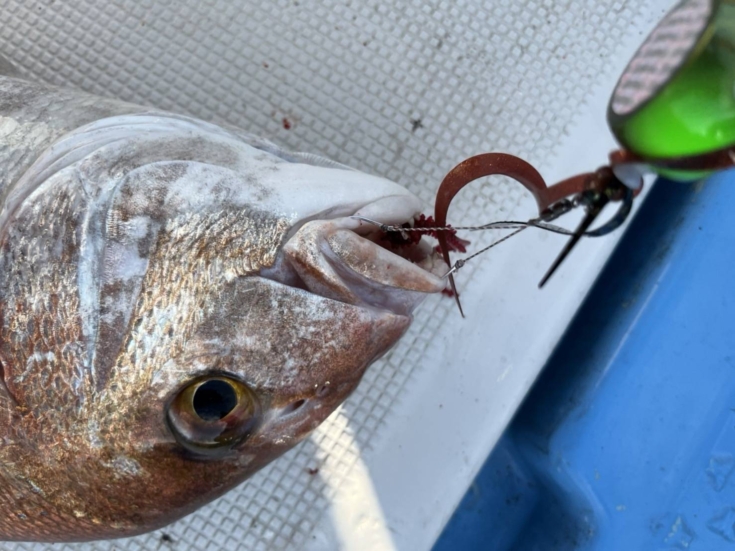 この魚はトレーラーワームをセットしている下バリ(閂マダイX9号)に喰ってきて、あとは他バリがフォローが入ったと思われます。