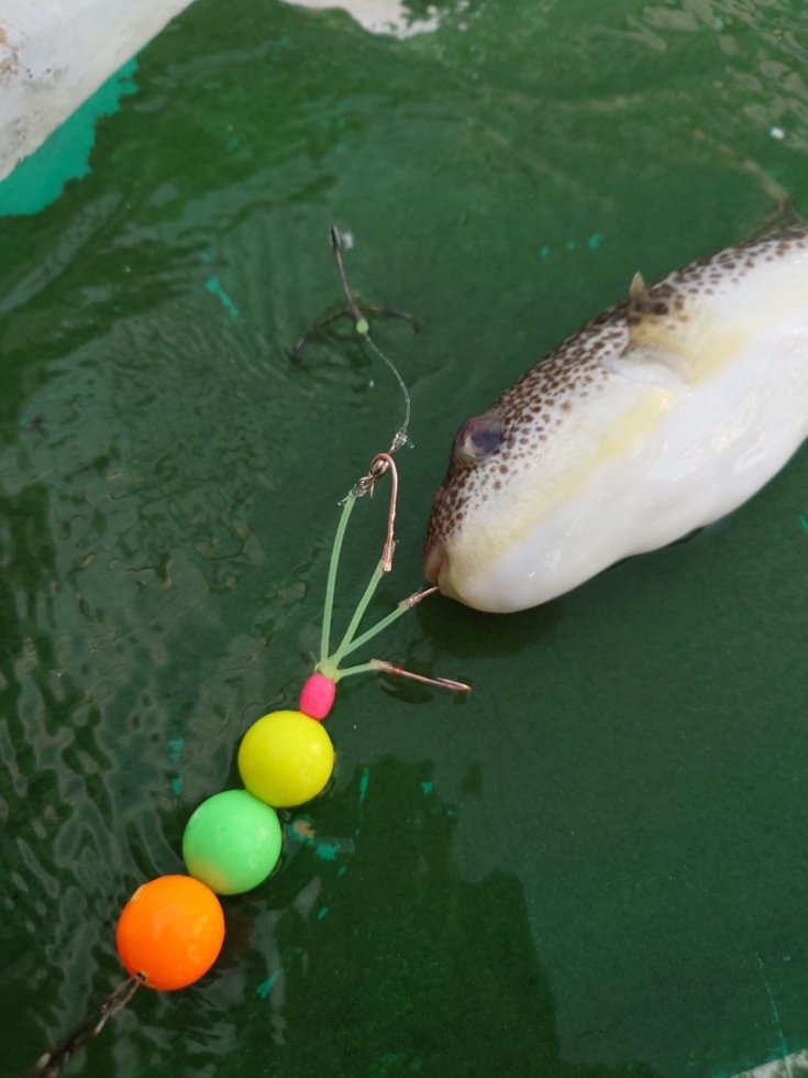 順調に釣果を伸ばして行く同船者より、餌負けして当たりは遠いので、重りを軽く30号→10号に変え、仕掛を送りながらフグを探す釣りに。