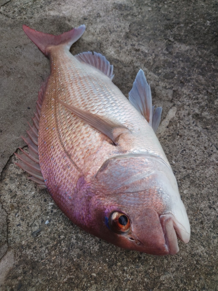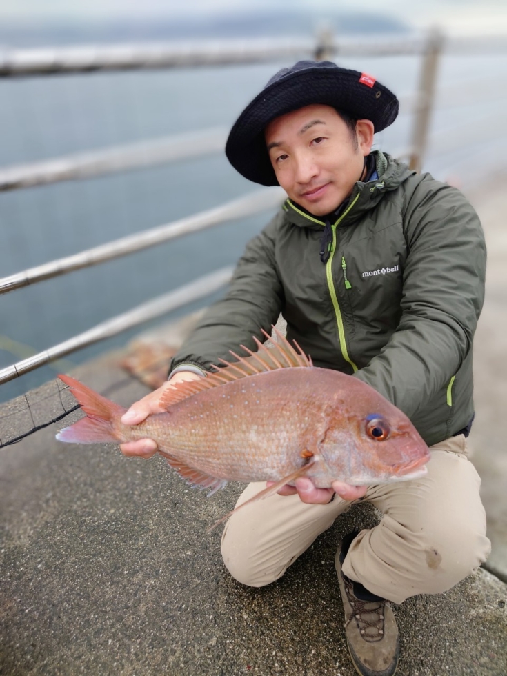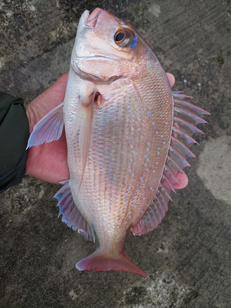 まずまずの引込みをみせて上がってきたのは、30cmクラスの綺麗な真鯛!いきなり本命がゲットできテンション高く、仕掛をキャストします。