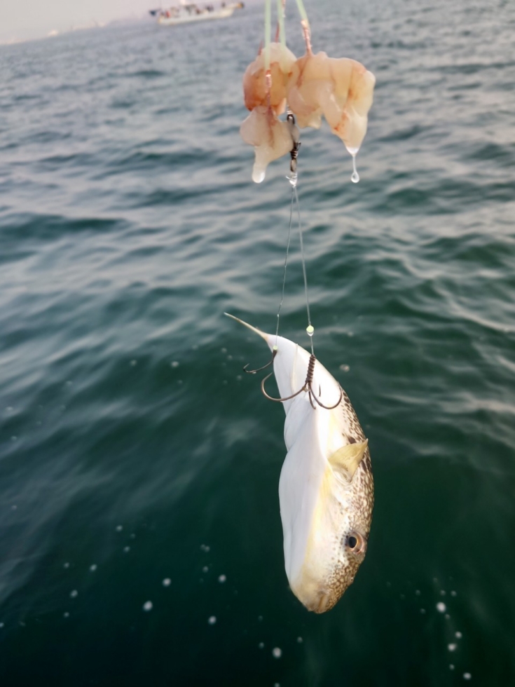 かかり釣りの場合は船が固定されており、ポイントが変わらないので、足元で反応が無ければ、キャストしたり、仕掛を流してフグを探す釣りに変更します。
