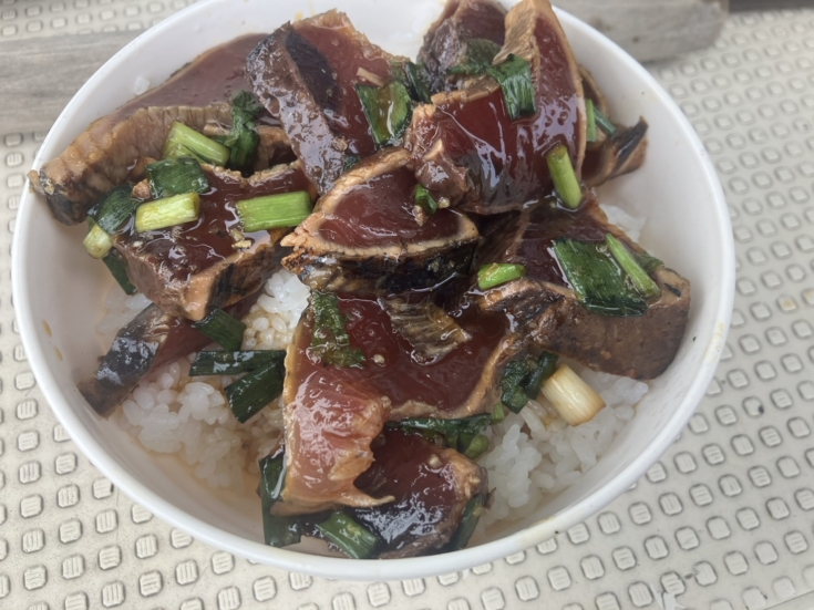 沖吉丸特製カツオ漬け丼で英気を養い午後の部スタートです。