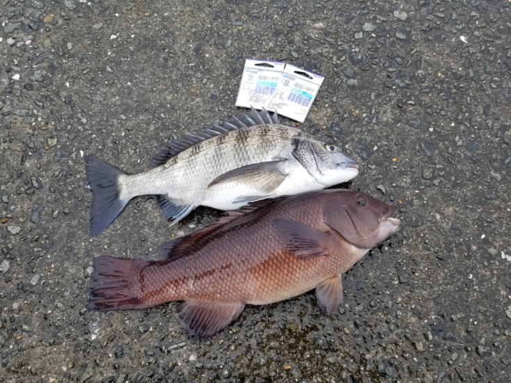 そのような負のスパイラルの中、先ほどまでとは若干引っ張りが弱いアタリがあり浮かしてくると、小型のコブダイが釣れてきました。本命のチヌでないにしろ、昨今人気ターゲットとなるコブダイが釣れ何よりでした。そして、納竿時間が近づきチヌが釣れないままこのまま終わってしまうのかと半ばあきらめかけていたその時、ゆっくりとウキが沈んでいきました。