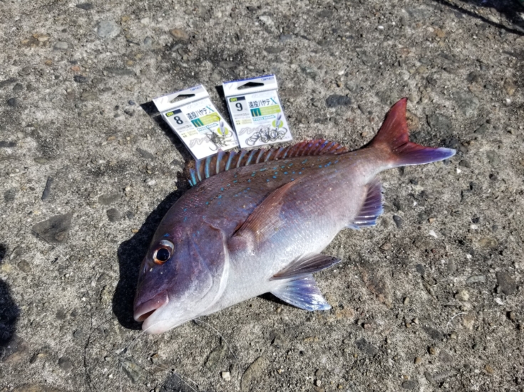 14時を過ぎたころ、終日ゆっくりだった潮から下潮が動きだし、それと同時にサシエサが残りだしました。15時が納竿だったため、最後のチャンスと判断し、マキエサをしっかり撒き、ウキ下を半ヒロほど深く調整、シラサエビの2匹刺しでアピール力を高め、狙いを定めました。すると、先日のチヌ釣りと同じく納竿間際で奇跡が起きました。流れていたウキが沈んだり浮いたりし、合わせるべきか判断しかねていた時、なんとウキが沈みきりました。その瞬間すかさず合わせを入れると、今日初めての竿曲がりです。バレないでくれと切に願いながらやり取りの末、30cm半ばのマダイが釣れてきました。この日も納竿間際で数少ないアタリを捉え、なんとか一尾モノにすることができ、ラスト垂水一文字釣行に花を添えることができ良かったです。これから先、私にとっては忘れられない一尾となるでしょう。