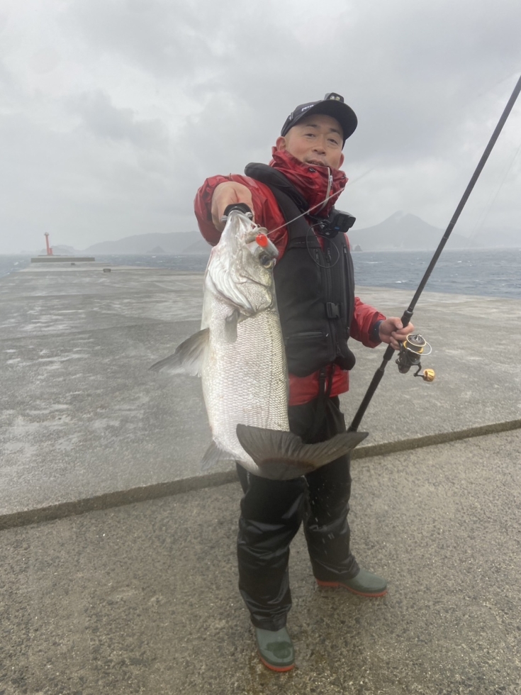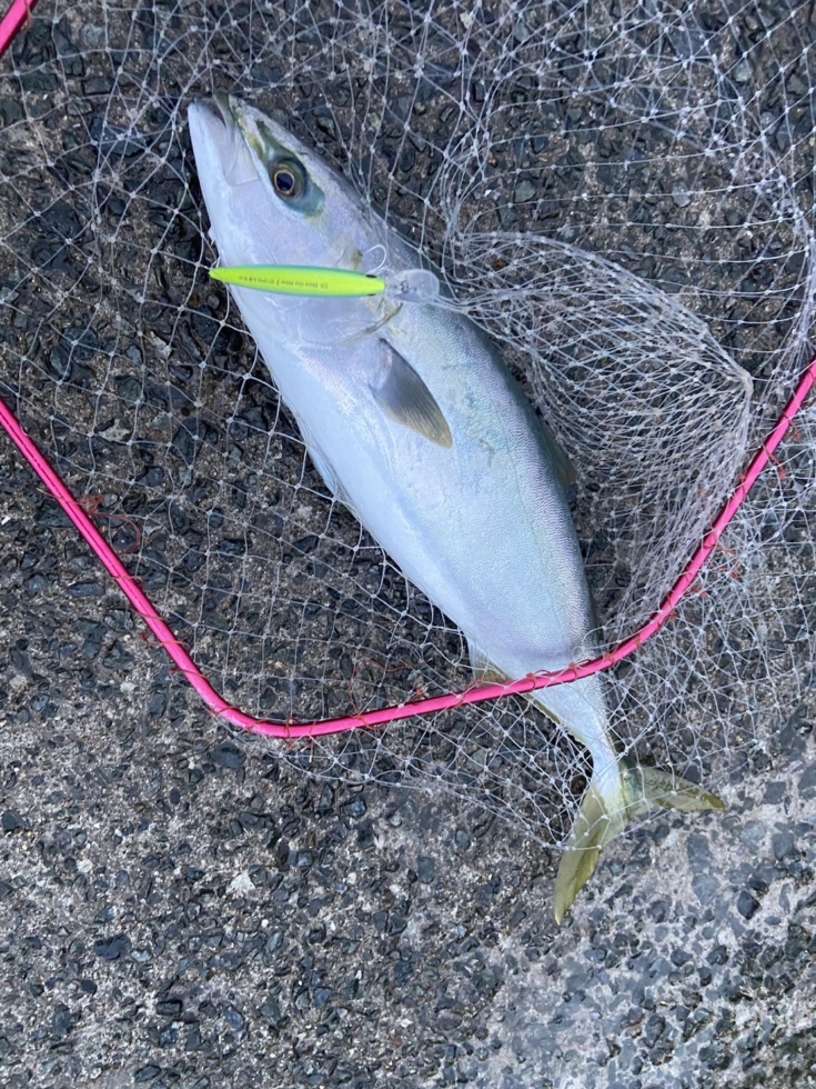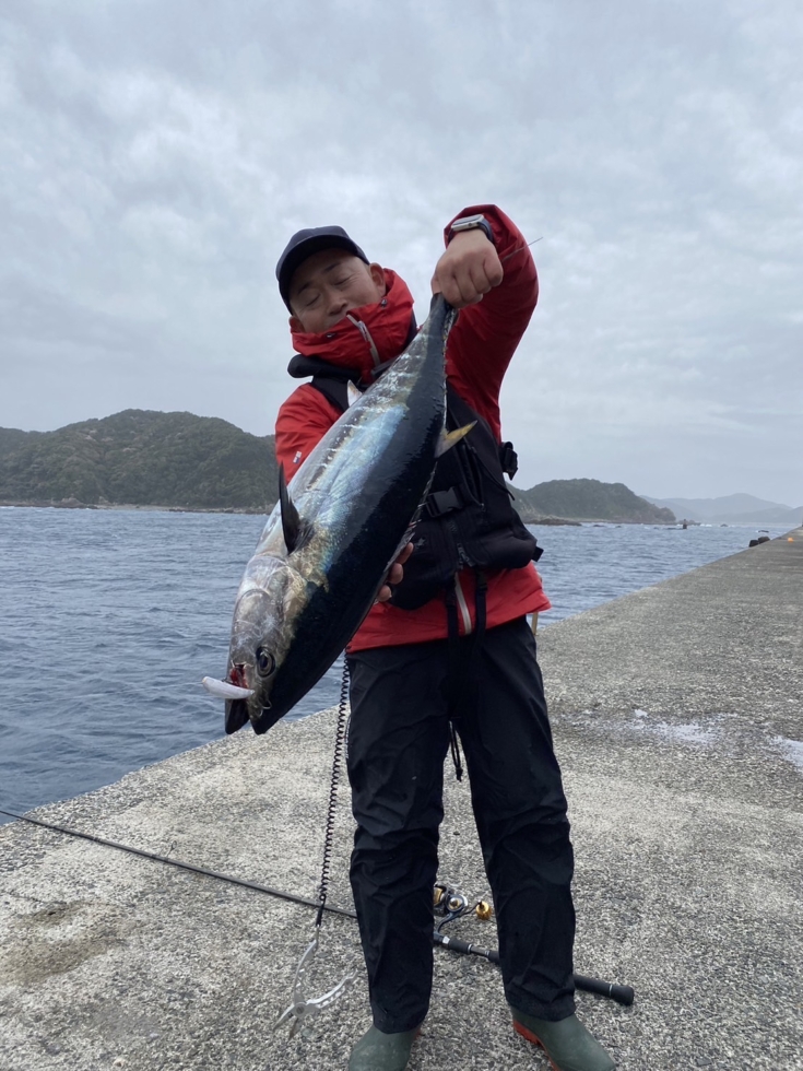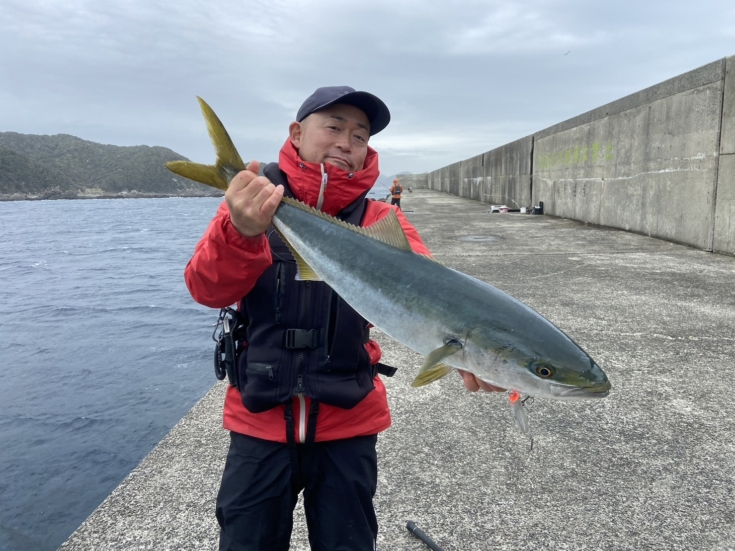 いつでもキャストできるように準備し、ボイルが発生したら狙いに行くスタイルで釣り続けていると、波止際でボイルがあったので、ダッシュして狙いに行くと、80cmのメジロがヒット。