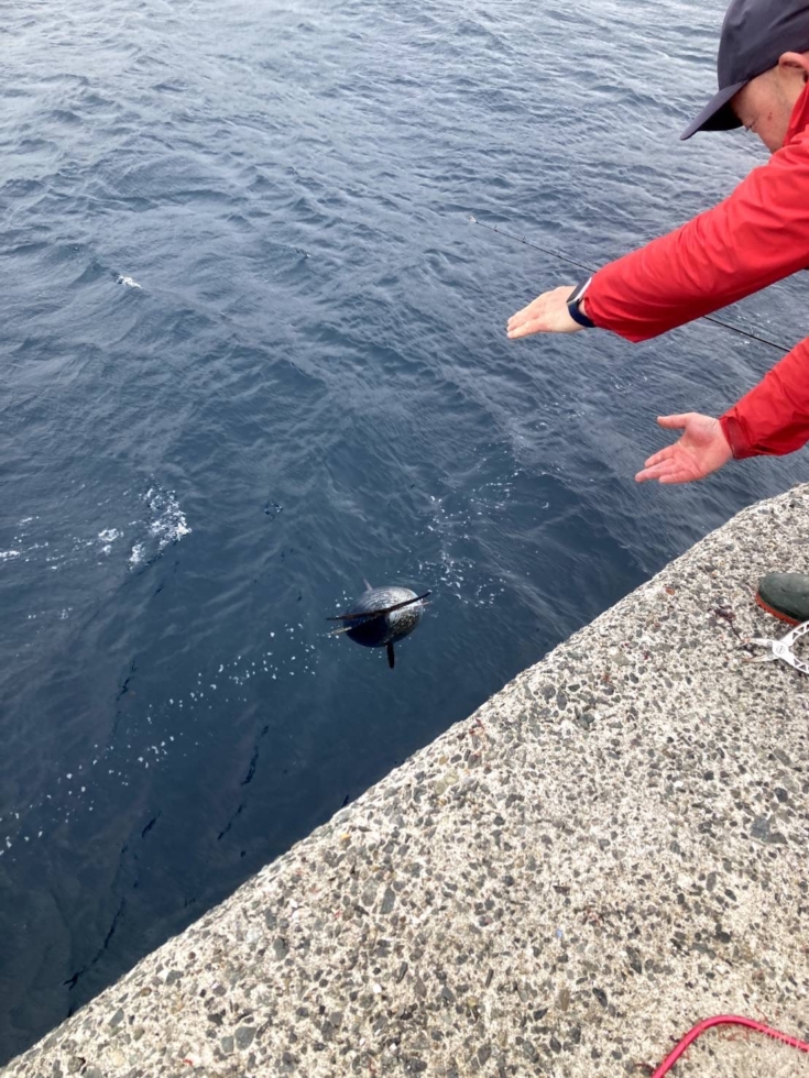 途中、沈みテトラに巻かれて冷や冷やしましたが、一か八かスプールを押さえてラインを出さないように強引に引きずり出してキャッチ。
