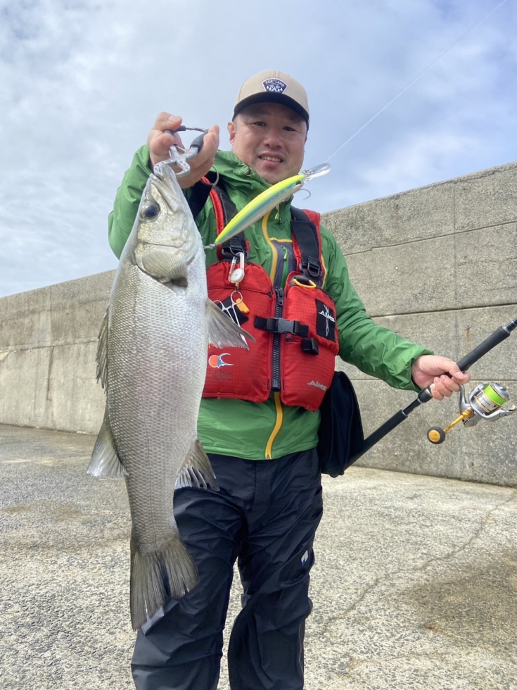 今回ルアーを車の中に忘れた松岡さんにセットアッパーランカーハンター125S-DR/STX-58#3を貸し、二人で狙いに行くと、テトラ際を攻めた松岡さんがヒラスズキを連発し、さらにメジロもゲット。