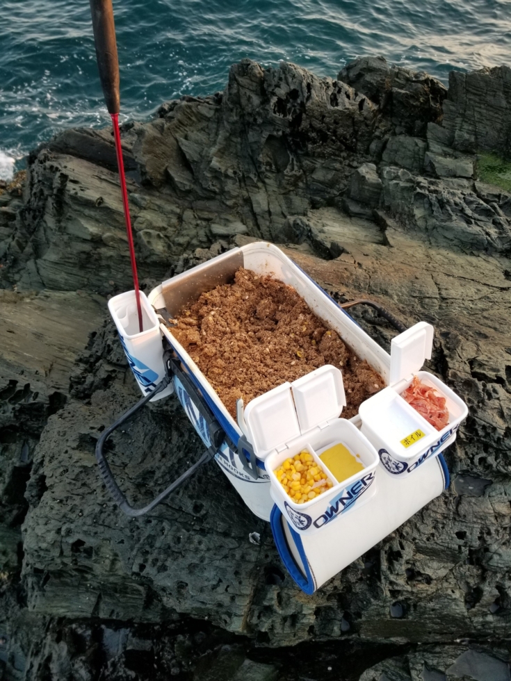 足元付近のシモリ周辺を浅棚で狙えばチヌが釣れそうな雰囲気だったのですが、あわよくばマダイも釣りたかったことや開始当初はほぼ無風だったためマキエや仕掛を操作しやすそうなことから、6ヒロの遠投釣りで狙いました。