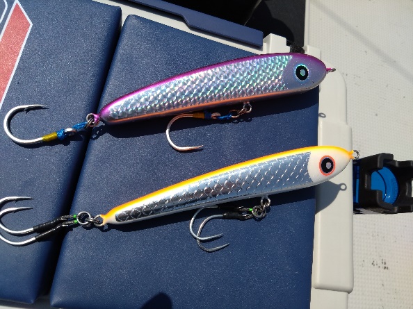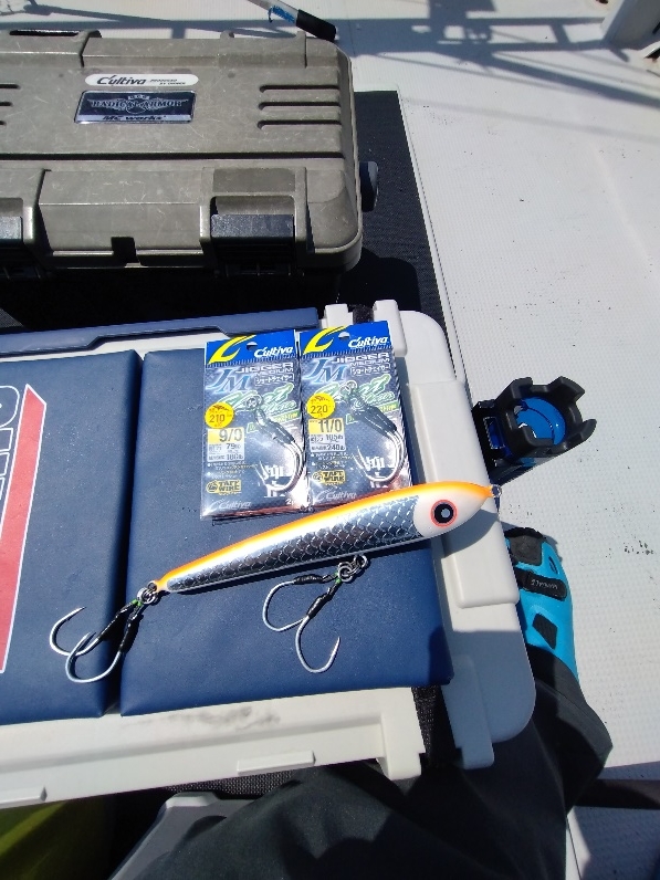 シングルフックの装着例でーす。今年発売したショートチェイサーは春のヒラマサのベイトの吸込みにはどんぴしゃですよ!