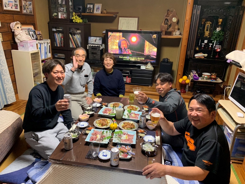 ブリの刺身や豚ちゃんや鍋を頂きました。お母ちゃんが次の日の朝弁当と昼弁当まで作ってくれてこれがまた絶品でした。