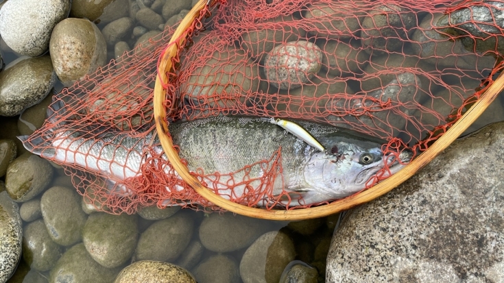 再度、同じところに投入してアクションを加えずにただ巻きしていると、ギラギラローリングしながらヒットしました。「フワッ」とテンションが抜けたときにルアーを咥えていたのでしょうか? サクラマスはずっとローリングしていて簡単に岸に乗り上がり、かっこ悪いながらネットをかぶせて58cm 2.2kgのサクラマスをランディングできました。