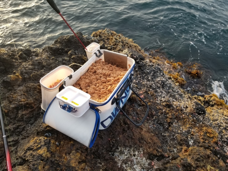 ところが待っては見たもののメリハリのある潮が発生せず、フカセで狙っても厳しいかと判断し、それでは遠くのポイントを深いタナで狙ってみようと、カゴ釣りへと変更。