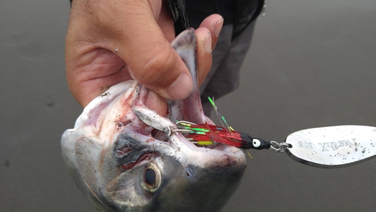 河口付近で竿が時々曲がり、自分の前でも跳ねが見られるようになったタイミングで荒さんから55gのスプーンにチェンジしてはとアドバイスをいただいたのでその通りにすると、その数投後、大遠投した直後にアタリがあり、合わせを入れるとフッキング成功。
