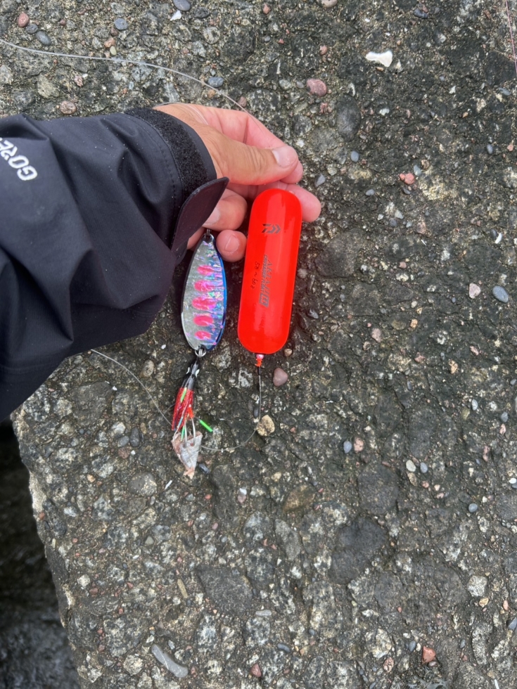 仕掛は浮子ルアーと呼ばれる北海道のアキアジ釣りでは独特のシステムで、レンジキープをするための大型ウキの下にスプーン45gを付けます。