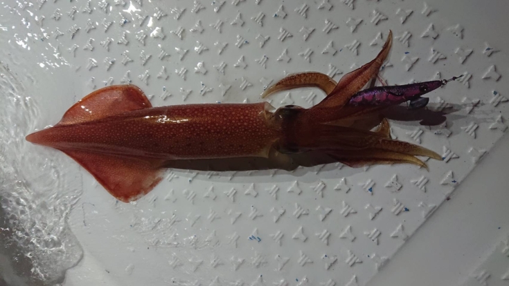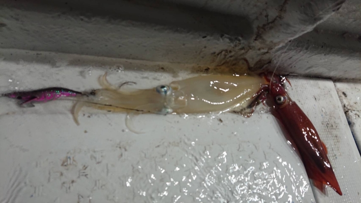 ケンサキの時合待ちに、別竿でジグを落とすとヒット。