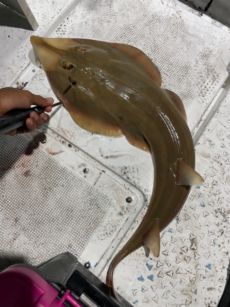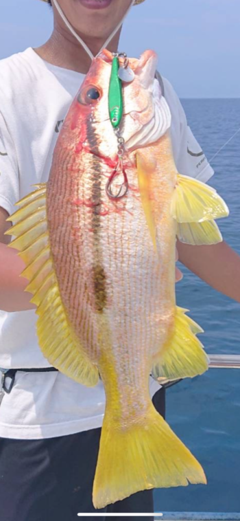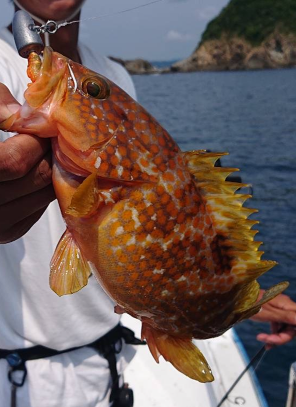 アタリとヒキが変わり、魚種不明。重たいので、ハタ系かなと思えば、、、