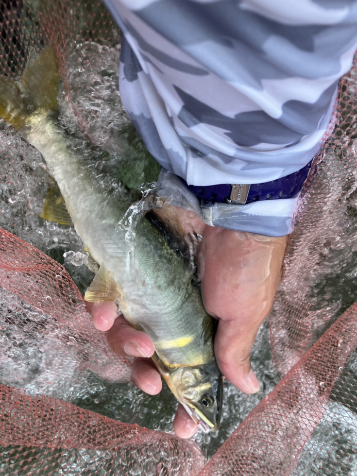 1ヶ月前にきたよりも今回の方がサイズが良く22〜27センチと増水も相まって強烈に竿を曲げ込んでくれます。