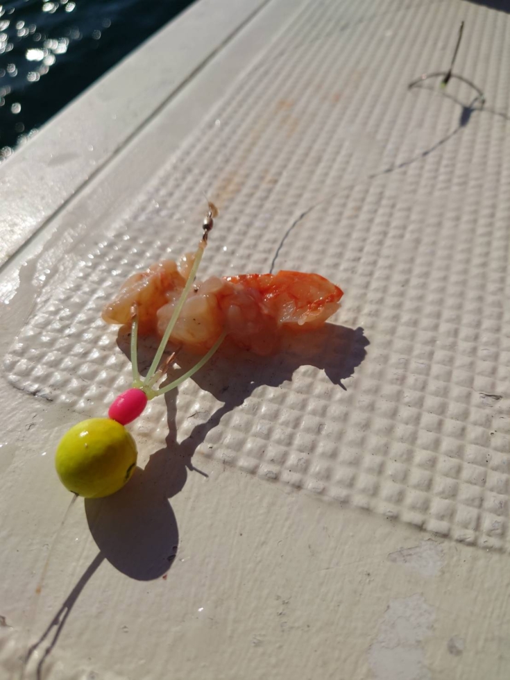 潮が飛んでいるので、オモリは50号スタート、餌はアルゼンチン赤海老で『カットウ一角ふぐチラシLL』にセットしてスタートです。