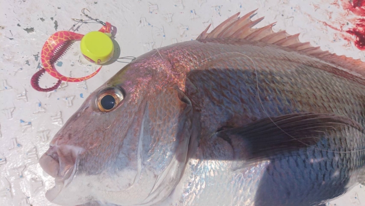 ワームを付けるフックに喰ってくる事が多いので、しっかり口の中を滑らせて良いところに掛ける狙いで半ネムリの閂マダイX。