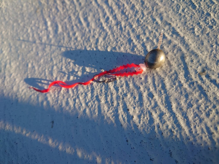 タングステンヘッドの40g&プロトフック2本鈎、オレンジの波動強めなネクタイでスタート