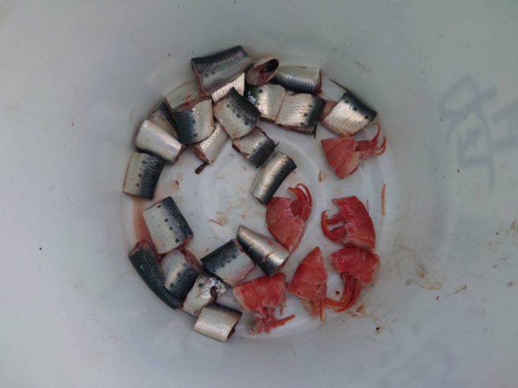 餌は、イワシやサンマのぶつ切りをメインにアルゼンチン赤エビ等を使用します。(餌は自身で用意)