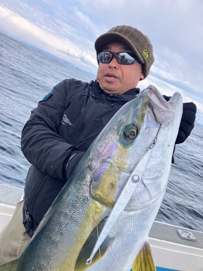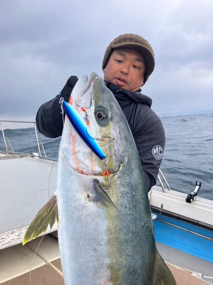 やはり先日の冷え込みで表層面の水温がかなり下がっておりヒラマサもプラグは見つけてくれるてるのでしょうが表層の水が冷たく出てくれないのでしょう!そこで常岡さんはBWHのプロトのシンペンでカウントをとり沈める方法に切り替え、15キロのヒラマサをあげました。鈎はチェイス9/0のダブル掛けです。そのころ、私はキャビンでうろたえてました。